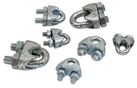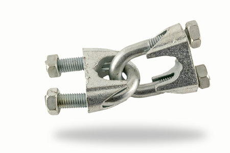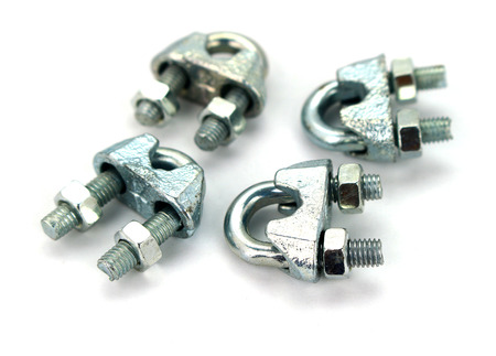 Close up old and weathered wire rope clip or clamp and turnbuckle