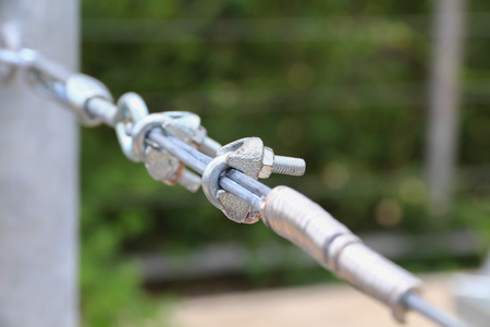 Metal fastening of the braided rope, screed of the cable on the bolts, the ring holds the tension of the iron cable. high quality photo