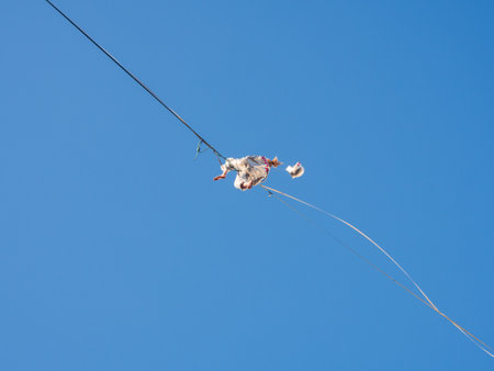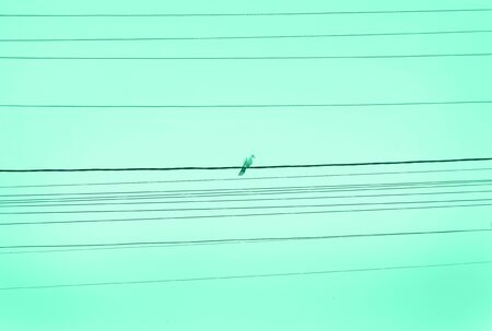 White dove sits on wires against a clear sky in trendy Aqua Menthe color toning. Tranquil nature wallpaper 2020 year. Turquoise mint colored birds screensaver on desktop. One wild pigeon alone.