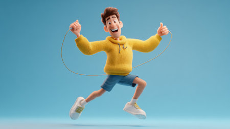 A joyful character happily skips rope with a big smile in a bright studio during daylight in a plain setting.