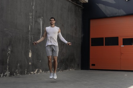 exercising and lifestyle concept - man skipping with jump rope outdoors on the roof