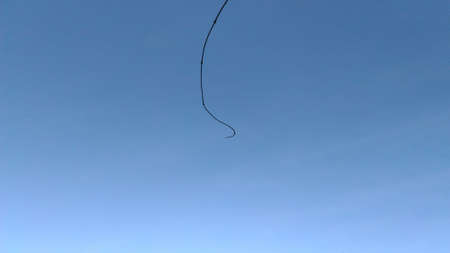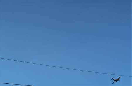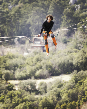 Highliner on the background of blue sky makes a move. A man is walking along a stretched sling. Performance tightrope walker. Man balances over the abyss. A decisive step forward.