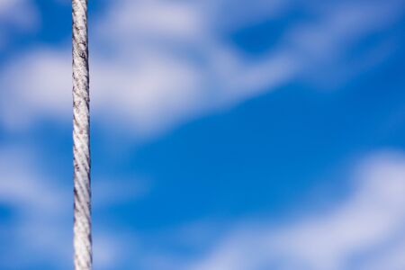 Go in for sports, jump rope, the benefits of movement for health, concept. A mans hand holds a rope in his fist, blue background