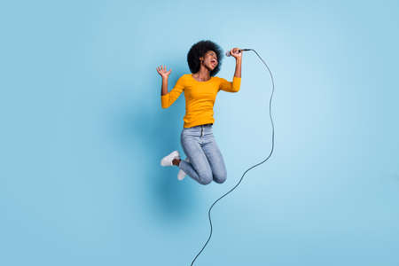 Photo portrait full length of singing woman holding mic in one hand jumping up isolated on pastel blue colored background