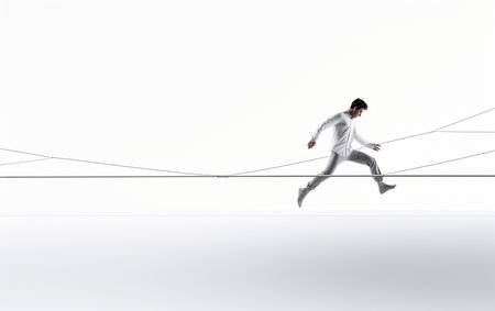 Silhouette of a man walking on a tightrope against stark, empty space.