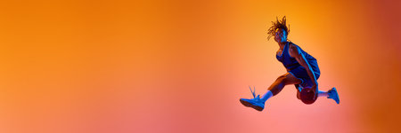 Athletic young man, basketball player in motion, jumping with ball against orange background in neon lights