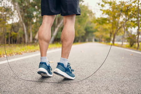 Young adult man jumping rope outdoors, lower legs and feet visible in midair, wearing athletic shoes, exercising on asphalt surface, engaging in fitness activity
