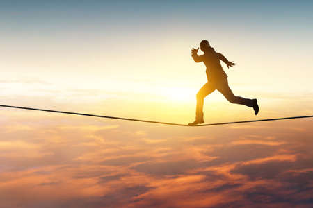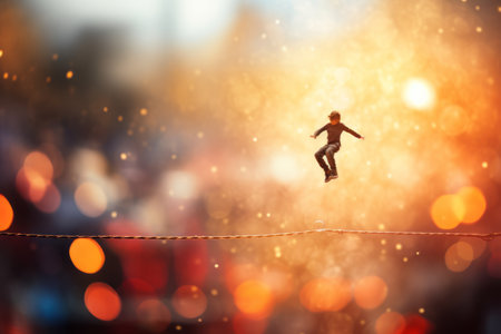 A silhouette of a person is seen walking on a tightrope against the backdrop of a cityscape during sunset. The individual appears to be balancing with arms outstretched, conveying a sense of adventure and daring. The city below is bustling with lights, and the sky is painted with hues of orange and blue, creating a dramatic and inspiring scene.