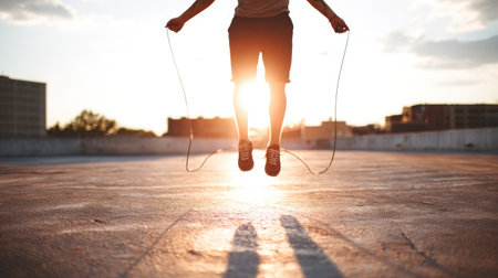 A dynamic scene of a young adult joyfully jumping rope during sunset in an urban environment, capturing the essence of vitality and fitness.
