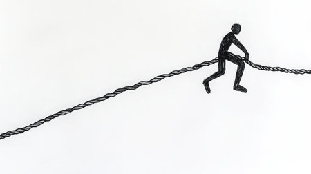 This minimalistic art piece features a figure balancing on a thin rope, representing the challenges and perseverance encountered in life's journey and personal growth.