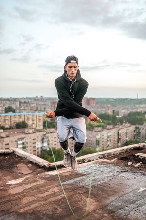 Young teenager boy jumping by the skipping rope on the house roof. Modern people fit challenges concept image.
