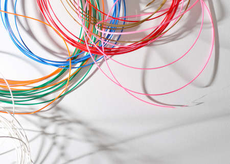 Abstract white background with skeins of colored fishing line. Long gray shadows, place for text. For banners, advertising, design.