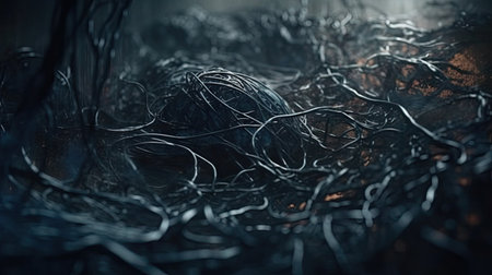 Tangled network cables resemble neurons, visually representing interrupted connections and communication issues in a high-tech environment.