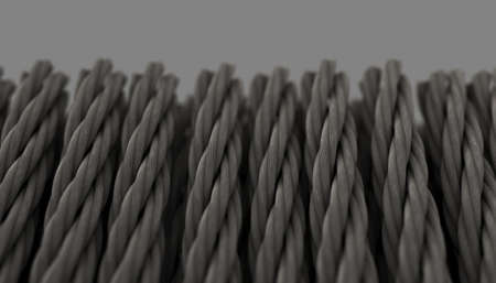 Beautiful isolated macro view of steel wire rope on solid gray background. Metal rope fence, edging of public transport stop near Stephens Green Green Park, Dublin, Ireland. Soft and selective focus