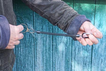 the mans hands are holding a black leash made of wire with an iron carabiner and gray metal rings against the backdrop of a green wall on the street