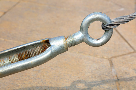 The end knot of steel rope. Stainless steel turnbuckle and sling steel in base. Detail of steel bolt anchor eye in ground