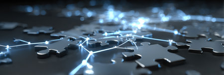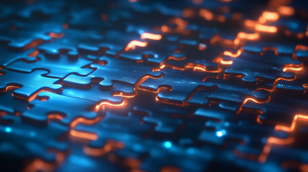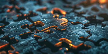This abstract close-up image showcases illuminated puzzle pieces with glowing edges against a dark backdrop, highlighting the intricate patterns and metallic textures.