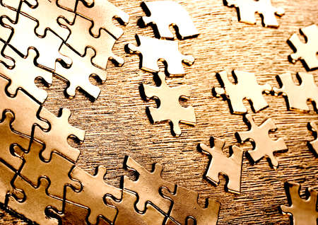 A close up of a jigsaw puzzle with a metallic look. The puzzle pieces are scattered and overlapping, creating a sense of chaos and disarray. The image evokes a feeling of frustration and confusion