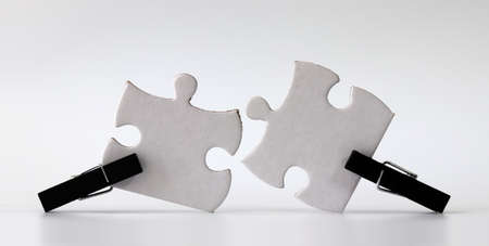 Black wooden tongs and two white puzzles. Puzzle pieces and business concepts.