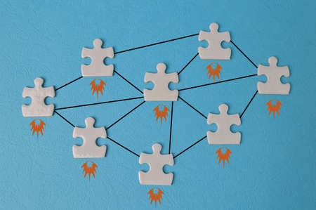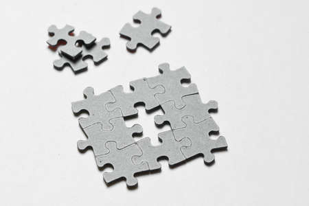 A set of puzzles, the process of collecting in a large pattern. Teamwork and problem solving, concept.