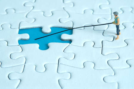 Miniature toy photography people. Fisher standing above white puzzle jigsaw piece. Isolated on blue background.
