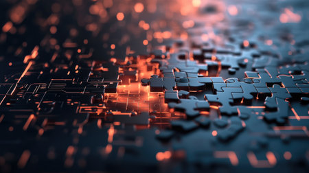 This captivating image showcases abstract digital puzzle pieces illuminated by warm orange light, creating a mesmerizing tech-inspired background perfect for modern designs.