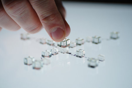 Arranging clear cubes. Network connection and finger manipulation for design. Innovative design and creativity.