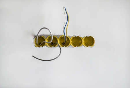 Electric plastic socket boxes with pvc pipe lines for installing electrical system on yellow cement wall background inside of house construction site
