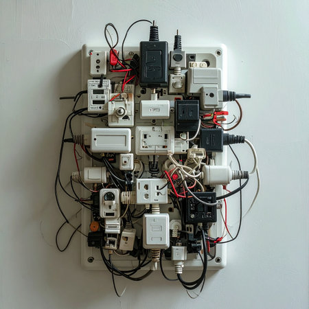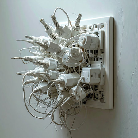 A tangled web of wires and adapters dangerously overloads a single power source, symbolizing the chaotic and overwhelming demands of modern technology.
