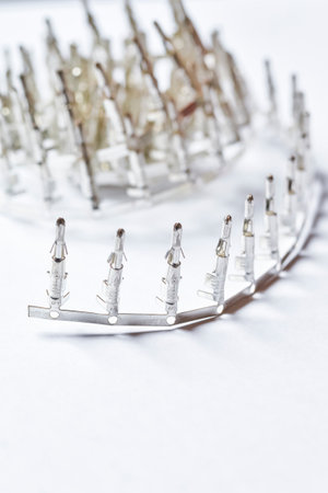 Line of New Silver Tinned External PCB Angular Connectors Placed on White Background. Vertical Orientation