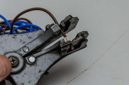 An electrician removes insulation from electrical wiring with a special tool with a stripper