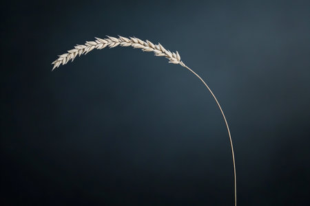A minimalist and elegant close-up of a single wheat stalk, gently curved, set against a deep, dark background, highlighting its delicate texture and form.
