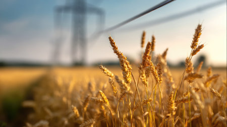 A serene view of golden wheat swaying gently in a field with power lines in the background, capturing the essence of rural agriculture during sunrise.