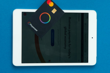 Payoneer credit card. Master Card. Global international payment system. Ukraine, Kyiv - February 4, 2024