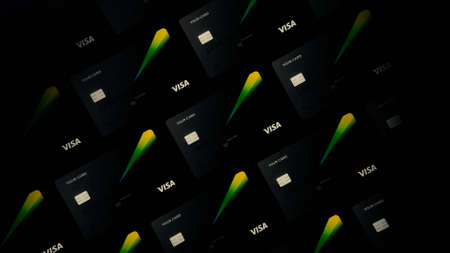 Abstract VISA credit cards, investment concept. Motion. Rows of new stylized credit or debit grey cards with a green ray moving on a dark background.