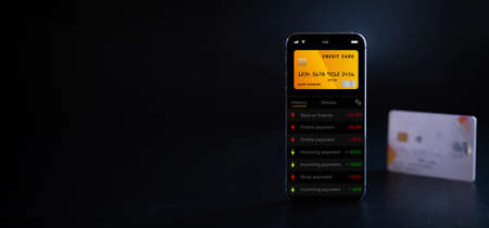 online banking. Mobile phone with internet online bank app. Credit card on black background. Save money business wallet