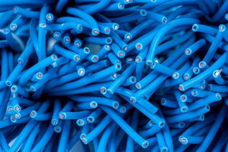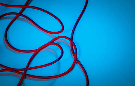 Red Tangled Cable on a Blue Background. Wired Internet. Abstract Background with Copy Space. Conceptual Photo about Global Communication.