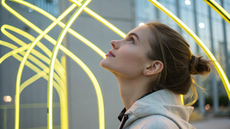 A contemplative young woman gazes slightly upward neon yellow wires framing her delicate face. The soft light creates an ethereal quality highlighting her thoughtful expression and.
