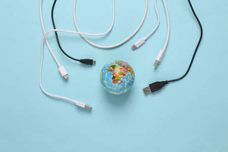 Different usb cable and globe on a blue background. Eco concept