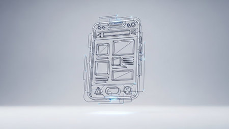 A wireframe 3D model of a smartphone displaying a user interface layout, representing app design and development.
