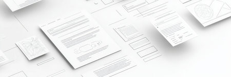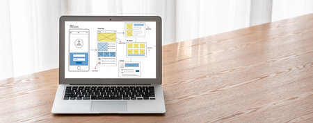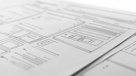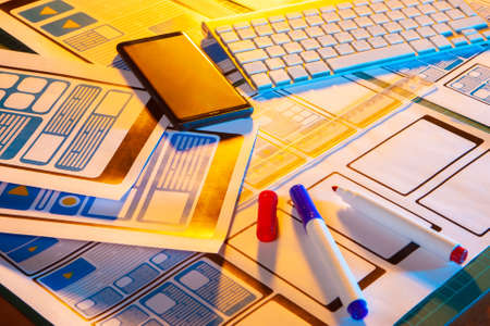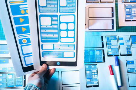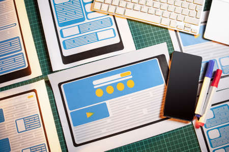 Papers on the table of a web designer. Application interface on paper. Concept - Designer table. App interface design. Work on apps security. Concept - digital design. Application development