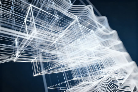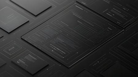 A gray background with cubes and wires, a minimalist design style of digital illustration, rendered in Cinema 4D, a monochromatic palette, industrial and product design, monochrome simplicity, and a bird's-eye view. The pattern is symmetrical on the left side of an office building wall, with a sense of technology and lines connecting different parts. --ar 26:15 --v 6.1 Job ID: 9923970f-9c2a-411a-8442-cd4b54bc00fe