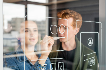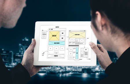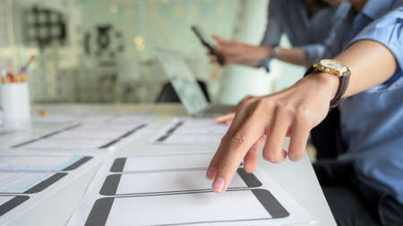 Graphic designers work together with UX UI designer planning application template layout framework for mobile phone computer mobile