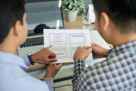 Cropped shot of young professional UI developer discussing on their project in simple office room