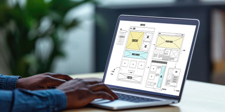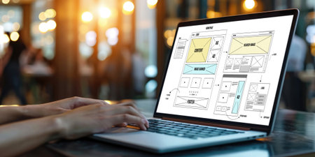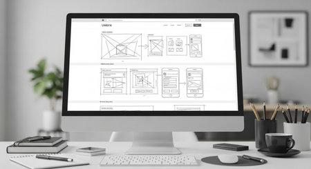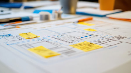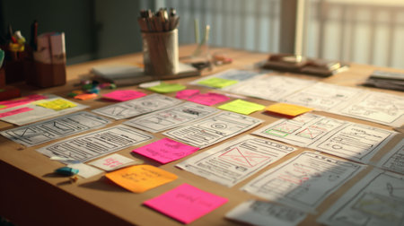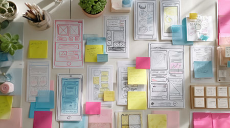 A vibrant and organized workspace showcasing wireframes and colorful sticky notes, perfect for UX designers and creative teams crafting innovative digital projects.