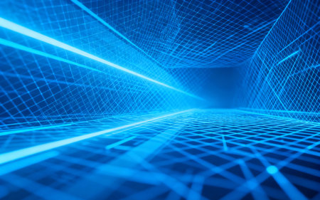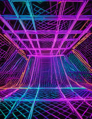 Illuminated tunnel mesmerizing abstract geometric grid of neon rays lights running through middle