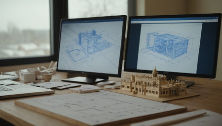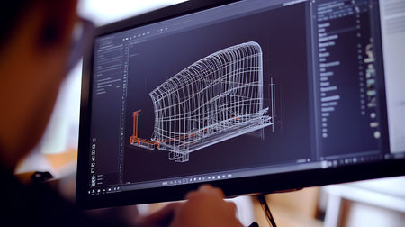 A computer monitor showcases a detailed 3D model in a blueprint style, reflecting modern technology and innovation in design and architecture.