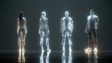 Four translucent, glowing holographic figures, two male and two female, stand in a dark, reflective space, showcasing advanced technology.