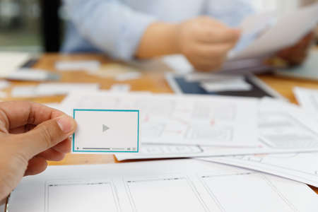 UX Graphic designer creative sketch and planning prototype wireframe for web mobile phone. Application development and user experience concept