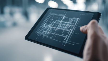 Engineer using a tablet to efficiently send precise CAD data to an industrial machine emphasizing accurate transmission and realtime synchronization.